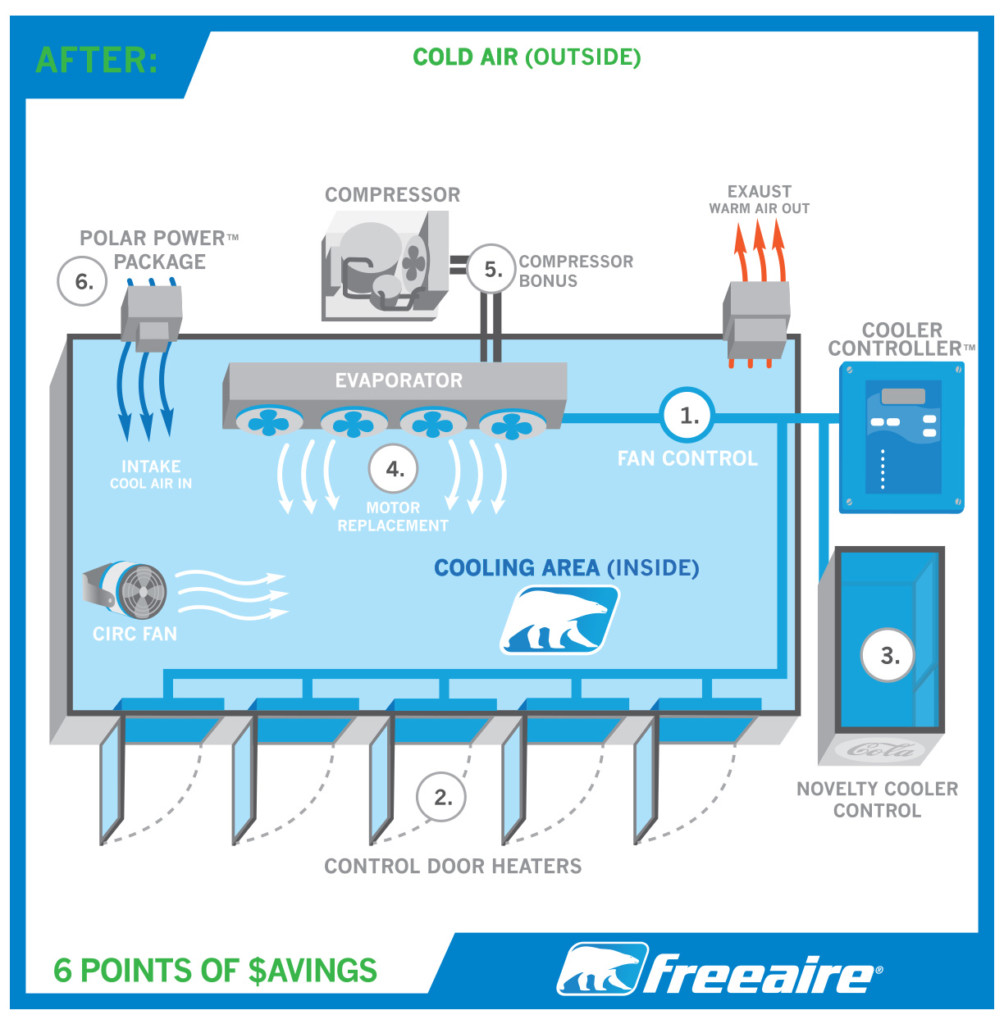 An American company has spotted the irony that many hotels and restaurants in cold areas use energy to power refrigeration inside warm buildings when it’s colder outside. In December of 2015, Arapahoe Basin was the latest to install a FreeAire system which uses simple sensors and circulation fans to monitor the temperature inside the cooler, as well as outside the building, and cycles cold, outside air into the cooler whenever temperatures allow. This saves energy by eliminating the need to use evaporator and condenser motors to cool air previously heated. By cycling cold, clean outside air, which is plentiful in Colorado at 10,800’, into the walk-in freezer the resort is able to run the cooler without using electricity (with the exception of a very small circulation fan) for about 220 days a year. By running the condenser so rarely they also avoid the need to run energy intensive defrost cycles for the machinery and have reduced wear and tear and associated regular maintenance drastically.