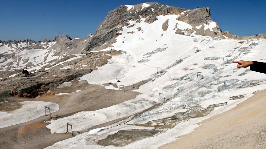 A study conducted by the Bavarian Academy of Sciences in 2015 revealed that glaciers in the German state of Bavaria are shrinking rapidly due to rising global temperatures. It found that the acreage covered by ice on the “Blaueis” and “Suedlicher Schneeferner” glaciers had more than halved over the past fifty years. The study has warned that the four glaciers could disappear entirely within the next twenty years, leaving the “Hoellentalferner” field on the Zugspitze, Germany’s highest mountain, as the only remaining glacier in the country. Here the glacier has been covered by a protective shield (a huge reflective tarpaulin) every summer for more than 25 years which has slowed but not stopped the rate of thaw. Based on laser scans, the resort estimates the glacier has lost 40 metres in thickness over the last 40 years.