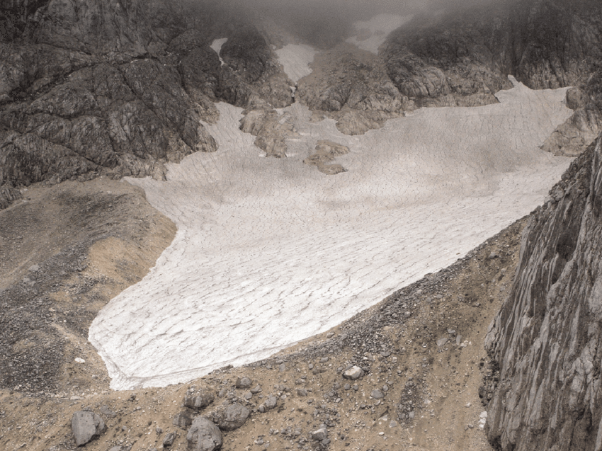 Located beneath mount Skuta, this is one of two surviving glaciers in Slovenia and the most south-easterly in the Alps. Due to climate change it has shrunk by almost half over the six-decades from 1950, when it had an area of 2.8 hectares, to 2013, when it was down to 1.6 hectares. The rate of melt has since accelerated.