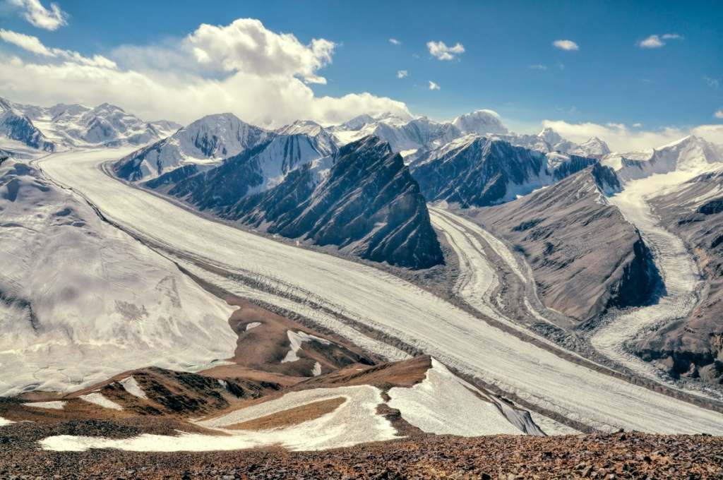 Located in the Central Tian Shan Mountains northeastern Kyrgyzstan, Engilchek is the sixth longest non-polar glacier in the world and is the largest and fastest moving glacier in Kyrgyzstan. At over 60 kilometres long and with an area of 17.2 square kilometres and an ice thickness of roughly 150–200 metres in the bottom parts it’s an impressive glacier, and its upper part extends in to three countries. The glacier is reported to be shrinking fast due to climate change with average temperature growth around 1.6ºC over the past 70 years meaning that, at the turn of the 21st century, according to some projections, half of Kyrgyzstan’s territory may be subject to desertification.