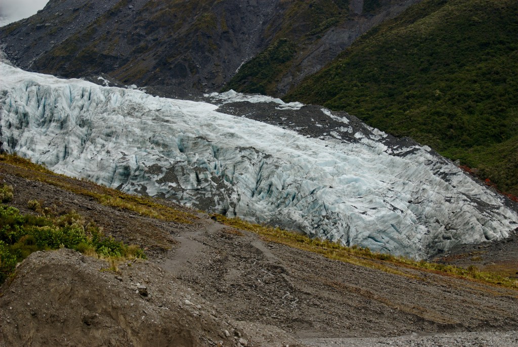 A 13 kilometre-long glacier located on the West Coast of New Zealand’s South Island, Te Moeka o Tuawe descends 2,600 vertical metres through the Southern Alps and ends up passing through rain forest towards the sea, only 300 metres above sea level. It is one of the few glaciers in the world to report growth of an average of around a metre a week for 24 years between 1985 and 2009, having retreated for the previous century, but it is now in rapid retreat. It’s 2009 extent is clearly visible as the end of vegetation’s level.