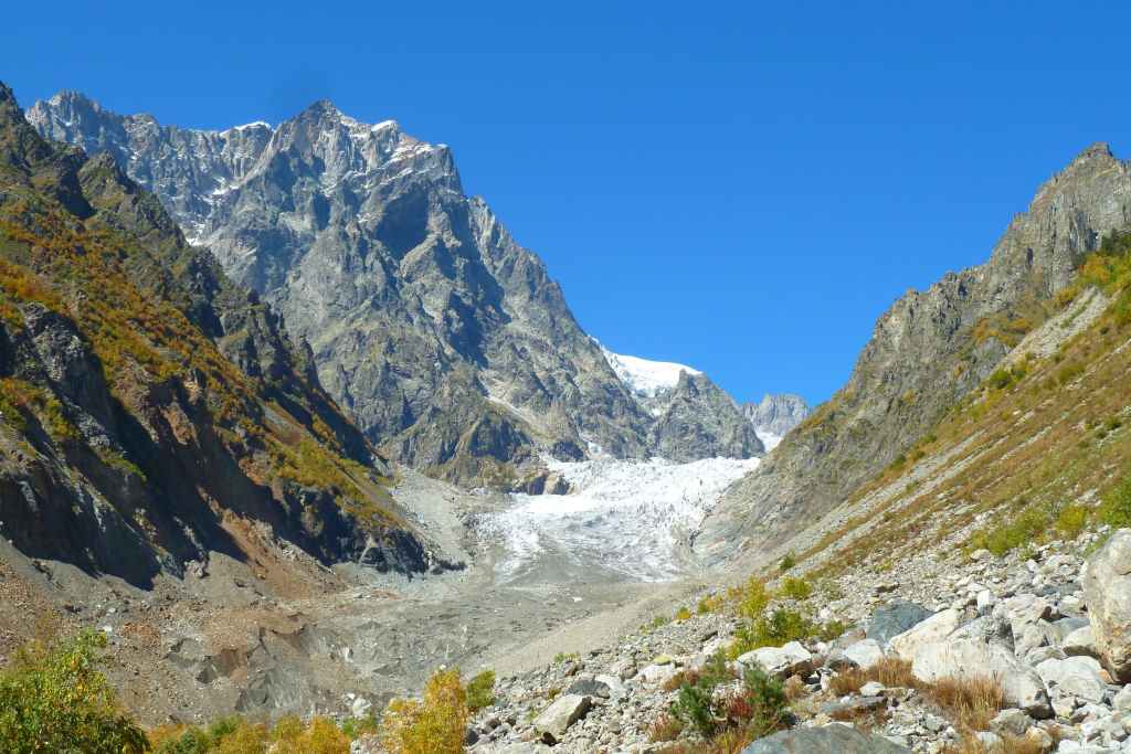 One of the largest glaciers in Georgia and has the lowest terminus position for the whole Caucasus region — 1,980 m above sea level and intrudes into the forest zone. A 2019 study found that due to the impact climate change, the area of the Chalaati Glacier decreased from about 12.2 square km to 9.2 square km over the last century. The drastic change in the size of the glacier was made by comparing old and modern images of glaciers in Georgia which found that overall the glaciers were shrinking at an average rate of 0.4% per year.